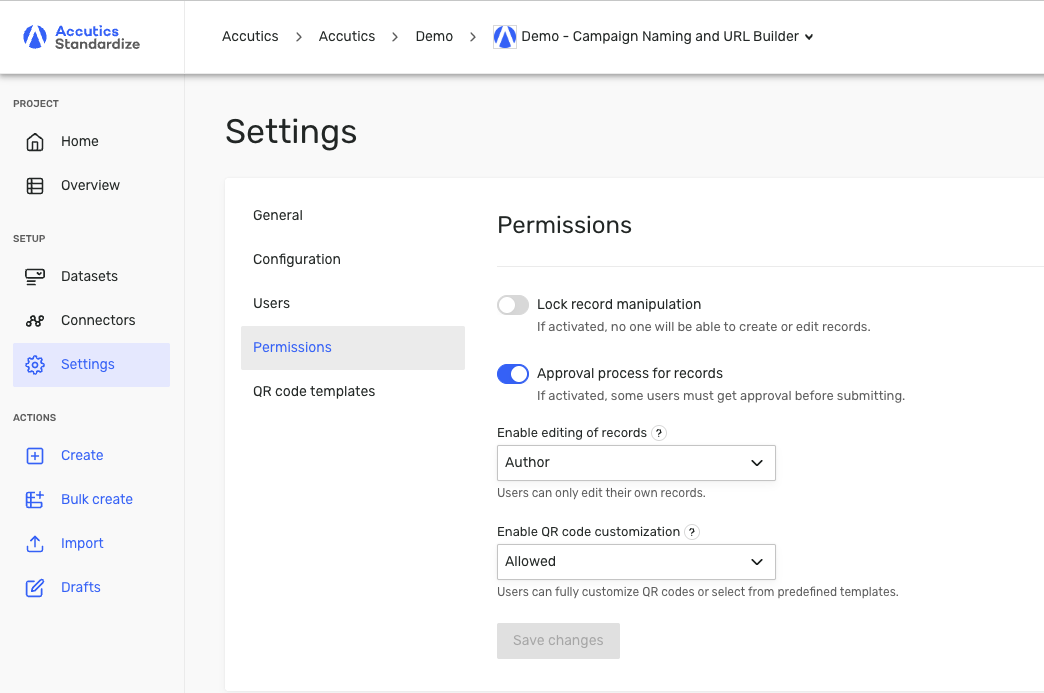 As a project admin, you may be required to adjust the settings of the project that will affect how the project operates, such as halting the ability to edit live records, or to allow users to amend QR code templates.